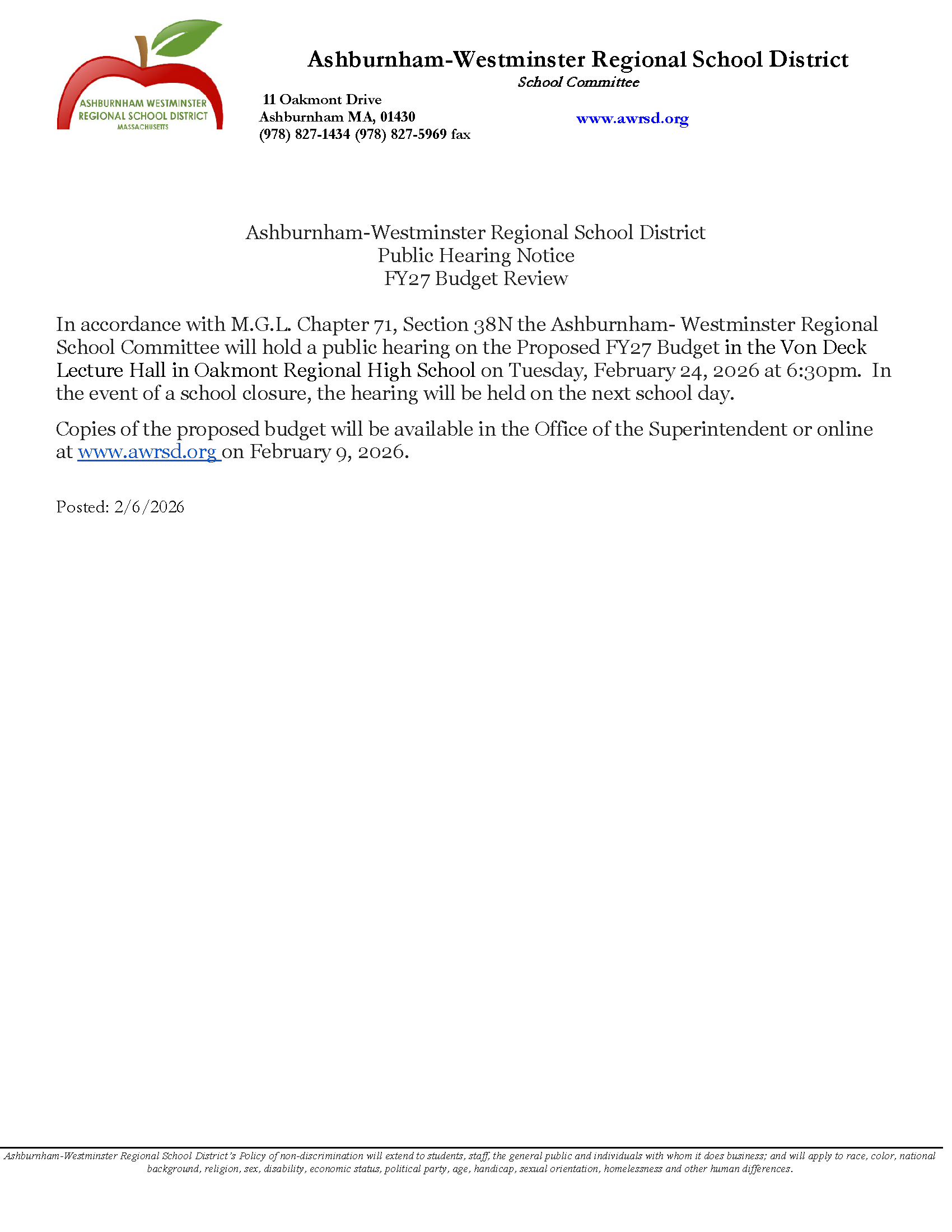 The Public Hearing for the AWRSD Proposed FY27 Budget will be held 2/24/2026 in Von Deck Lecture Hall in Oakmont Regional High School. In the event of a school closure, the hearing will be held on ...